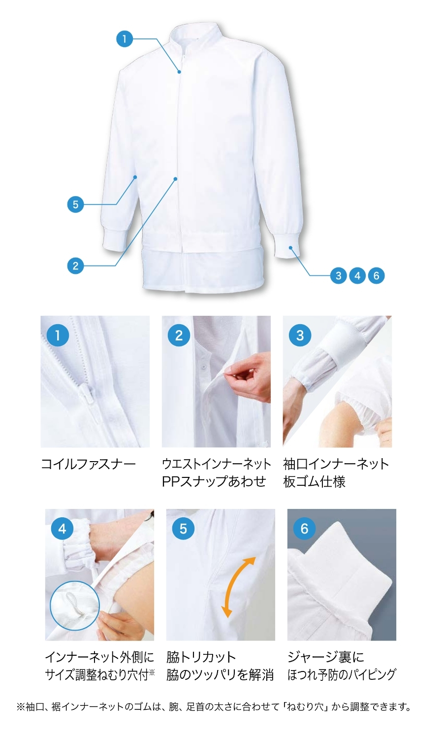 食品工場 ・化粧品工場・印刷工場など異物混入防止の優れたクリーンウェア。