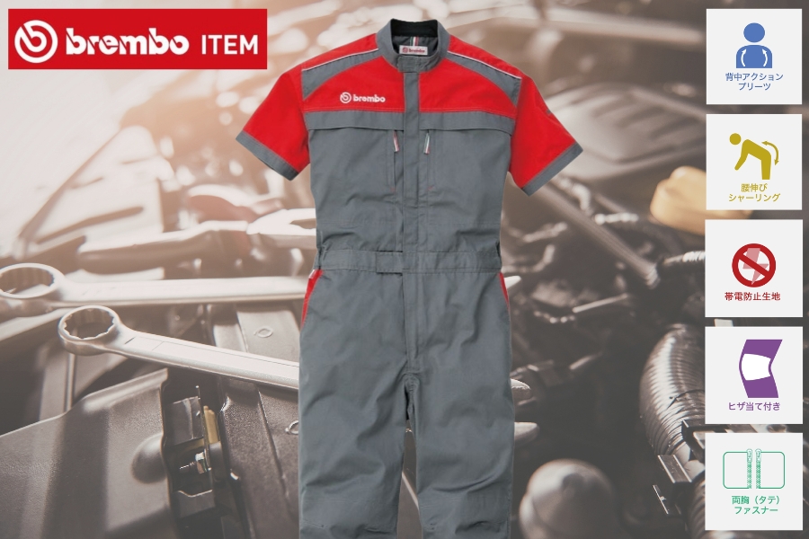 ブレンボブランドの帯電防止半袖メカニックスーツ