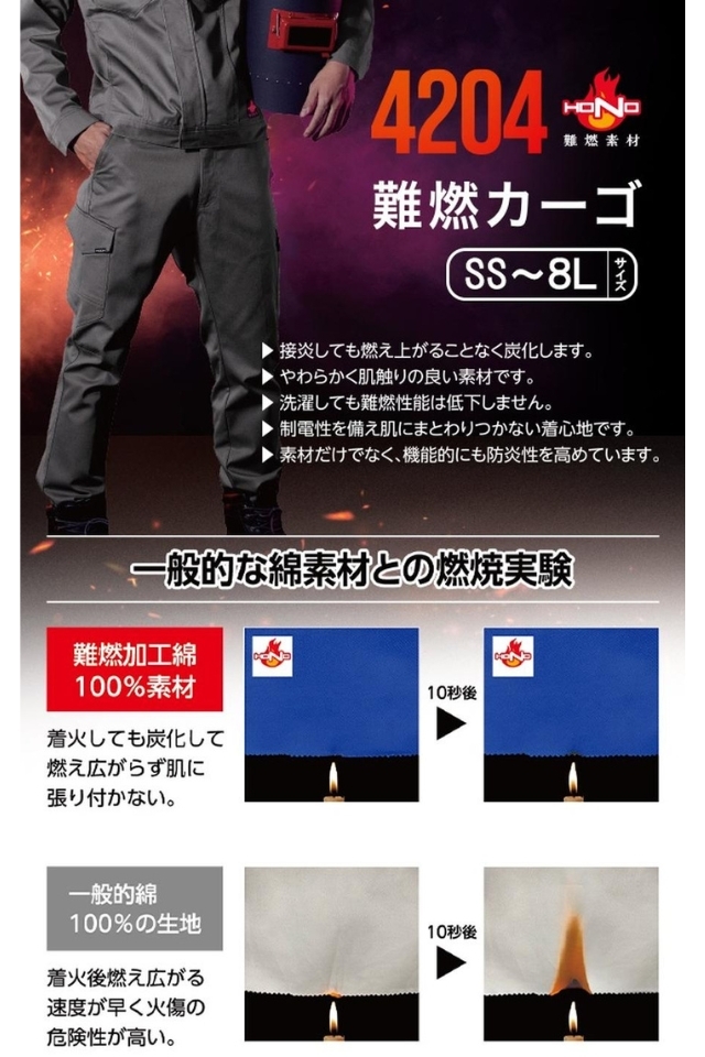 耐炎耐熱帯電防止の防炎作業服HONO難燃カーゴパンツ4204