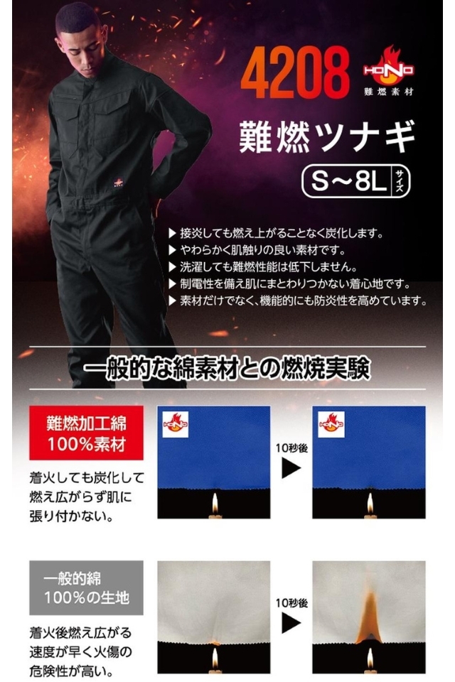 耐炎耐熱帯電防止の防炎作業服HONO難燃ツナギ4208