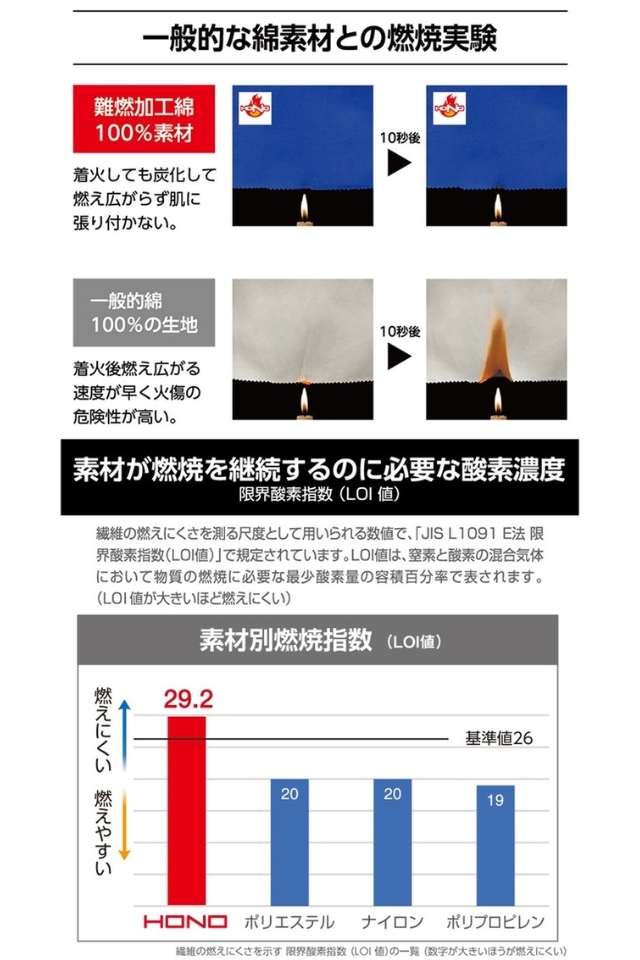 接炎しても燃え上がることなく炭化し洗濯しても難燃性能が低下しない綿100%防護服。