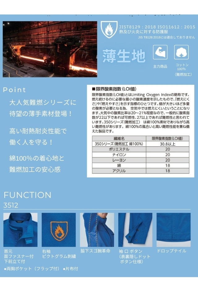 限界酸素指数(LOI値)30.8以上の炎や熱から身を守る最強ワークウェア。