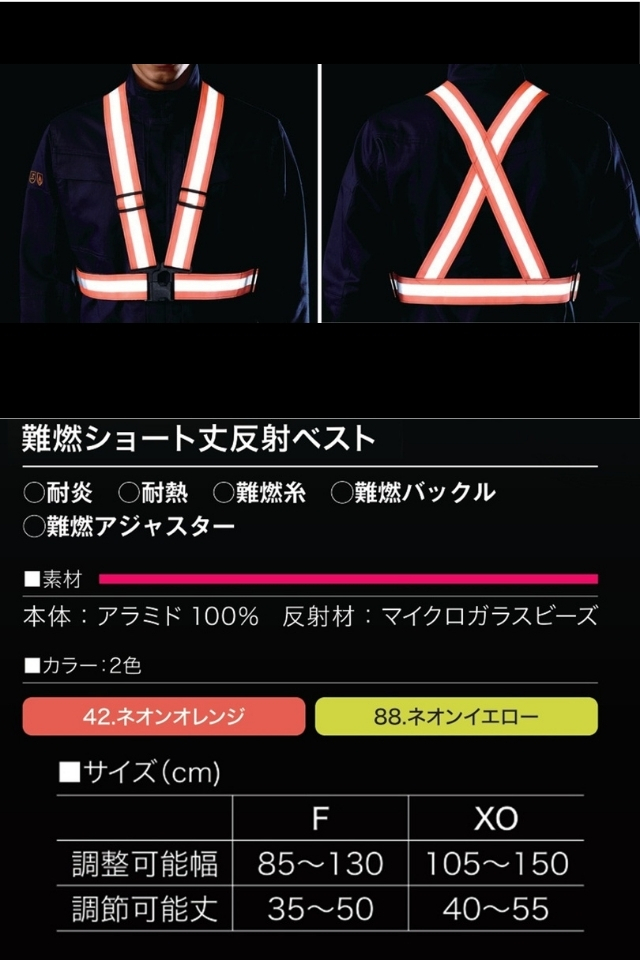 難燃ショート丈反射ベストは本体にアラミド100%を採用し難燃バックル・難燃アジャスターまで徹底。